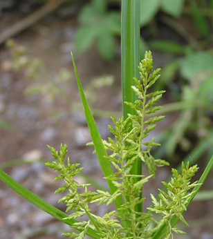 形態(tài)特征:稈叢生,直立,株高20—85cm,扁三棱狀。葉基生,較稈短,葉鞘紅褐色。苞片3—5,葉狀,下部2—3片較花序長;長側(cè)枝聚傘花序復(fù)出,有4—9條長短不一的輻射枝,每枝具5—10個穗狀花序,個別3個,穗狀花序長卵形,有小穗5—12個;小穗長圓形扁平,具花5—22朵;鱗片寬倒卵形,先端略缺,有短尖,背部有綠色龍骨狀突起,兩側(cè)黃色;雄蕊、柱頭各3個。小堅果三棱狀倒卵形,黑褐色??糠N子繁殖。