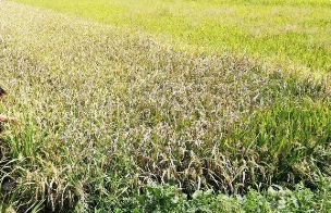 2. 急性型主要在環(huán)境條件適宜和品種感病的情況下發(fā)生。葉片病斑暗綠色,迅速擴(kuò)展,幾天內(nèi)可使全葉呈青灰色或灰綠色,呈開(kāi)水燙傷狀,隨即縱卷青枯,病部也有蜜黃色珠狀菌膿。此種癥狀的出現(xiàn),表示病害正在急劇發(fā)展。