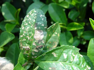 茶白星病主要為害嫩葉、嫩芽、嫩莖及葉柄,以嫩葉為主。嫩葉染病初生針尖大小的褐色小點(diǎn),后逐漸擴(kuò)展成直徑為0.5?2.0mm的圓形小斑,中間紅褐色,邊緣有暗褐色稍微突起的線紋,病健分界明顯。成熟病斑中央呈灰白色,中間凹陷,邊緣具暗褐色至紫褐色隆起線,其上散生黑色小點(diǎn)。病葉上病斑數(shù)達(dá)幾十個(gè)至數(shù)百個(gè),有的相互融合成不規(guī)則形大斑,葉片變形或卷曲,葉脈染病葉片扭曲或畸形。當(dāng)一張葉片上有10個(gè)以上 病斑時(shí),病葉發(fā)黃,引起脫落,并嚴(yán)重降低茶葉品質(zhì)。嫩莖和葉柄發(fā)病,初呈暗褐色,后呈灰白色,病部亦生黑色小粒點(diǎn),病梢節(jié)間 長(zhǎng)度明顯短縮,百芽重減少,對(duì)夾葉增多。嚴(yán)重發(fā)生時(shí)引起茶樹(shù)嫩 梢芽葉畸形,生長(zhǎng)停滯。病情嚴(yán)重時(shí)蔓延至全梢,形成梢枯。