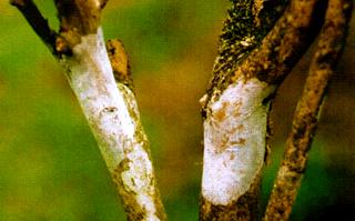 茶褐色膏藥?。涸谥l或根莖部形成橢圓形至不規(guī)則形厚菌膜,栗褐色,較灰色膏藥病稍厚,表面絲絨狀,較粗糙,邊緣有一圈窄灰白色帶,后期表面發(fā)生龜裂,易脫落。