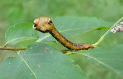 幼蟲:一齡幼蟲黑色,背線灰白色。末齡幼蟲體長為45?65mm,體色多變,有綠色、灰色、灰黑色等。頭部略呈方形,棕褐色,表面散生深褐色瘤狀物,頭頂中央有1近三角形下陷的褐色斑紋,兩側(cè)呈牛角狀突出。前胸背面兩側(cè)各有角狀突起1個,前胸腹面黑色(油桐尺蠖腹面為灰綠色),腹部第八節(jié)背面無突起。