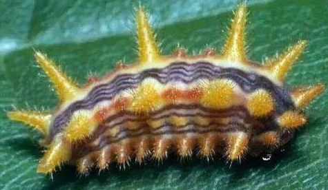 幼蟲:老熟時(shí)體長(zhǎng)為8?10mm,寬為5?7mm。近橢圓形,龜狀,翠綠色,體表光滑,略角質(zhì)化,無(wú)刺突與刺毛,有金黃色紋,亞背線黃色,背線與側(cè)線處每節(jié)各具1暗色斑點(diǎn),前胸紅褐色,中胸背板深褐色,其上具淡黃色斑點(diǎn)6個(gè),間或背腹中部數(shù)節(jié)亞背線處有紅點(diǎn)2?4對(duì)。