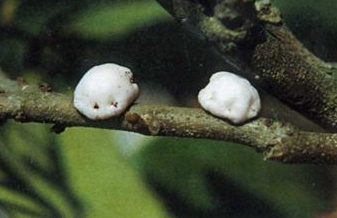 成蟲:雌成蟲體長為4?5mm,紅褐色至紫褐色,體背隆起呈半球形,腹端背面有圓錐形突起。雌成蟲介殼半球形,直徑為5?9mm,白色稍帶粉紅色,蠟質(zhì)厚,前期背中央角狀突起,周圍有8個鈍角狀小突起,后期角狀突起消失。雄成蟲體長約1mm,赤褐色,翅1對,半透明,腹末有一枚針狀交配器。