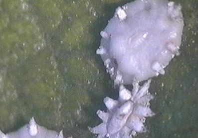 若蟲:初孵時橢圓形,扁平,長約0.3mm,淡紅褐色,觸角及足灰白,腹末具1對細長尾絲。定居后漸泌白蠟形成介殼。雌若蟲介殼橢圓微突,周緣現(xiàn)8個蠟突。雄若蟲介殼長橢圓形,星芒狀,周緣有13個角突。