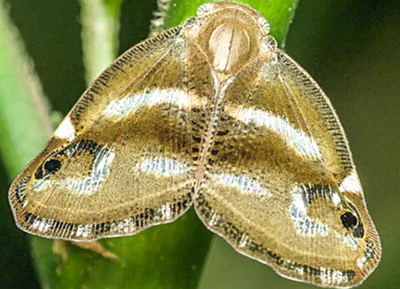 成蟲:體長為7?9mm,翅展為11?15mm。體褐色至深褐色,以中胸背板色最深,腹面色淺,后翅色淡,前翅油狀光澤明顯。額具中脊,無側(cè)脊,前胸背板具中脊,兩邊有刻點;中胸背板具中脊3條,中脊長而直,側(cè)脊從中部向前分叉,二內(nèi)叉內(nèi)斜,端部互相靠近,外叉短,基部斷開。前翅廣闊,外緣和內(nèi)緣長度相等;前緣的橫脈域和外緣整齊排列的端室連成一寬帶,并略呈波狀;前緣近端部2/5處有一長三角形透明斑,近頂角有一黑褐色隆起眼斑;內(nèi)橫帶透明,寬而略呈弧形,前端不到前緣的橫脈域;外橫帶由2條透明的短橫帶組成,其前帶的末端向內(nèi)伸岀一小叉;內(nèi)外橫帶之間近頂角處有一黑褐色隆起的眼斑。后翅翅脈色深,二橫帶均無色透明,帶上的脈紋白色;翅后緣有無色透明縱條。后足脛節(jié)外側(cè)具2個大刺和1個極小的刺。