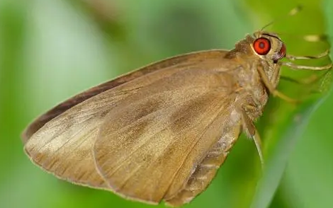 成蟲:雌成蟲體長28?31mm,翅展60?80mm;雄成蟲體長23?26mm,翅展54?65mm。體黃褐色或茶褐色;頭部和胸部密被黃色或灰褐色鱗毛;復(fù)眼黑褐色,半球形,被褐色細短眼球毛;觸角錘狀,黑褐色,近膨大部呈白色;前翅黃褐色,翅中央有2個黃色方形大斑,近外緣有1個黃色方形小斑,這3個斑呈三角形排列,前翅前緣近基部被灰黃色鱗毛;后翅黃褐色或茶褐色,無斑紋,緣毛白色。