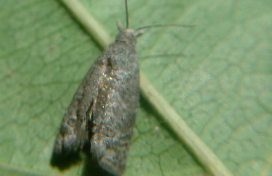 成蟲:體灰褐色,復(fù)眼大,黑褐色。觸角線狀,灰褐色,著生于復(fù)眼之間,停息時觸角向后延伸。下唇須短,灰色,先膨大后變細,折疊前伸。胸部灰色,混有白色鱗片。雌蛾的腹部較雄蛾肥大。雄蛾體長5?7mm,翅展觸角前7節(jié)粗長,第八、九節(jié)變細,形成一斜凹槽,第十一節(jié)有一錘狀突起。前翅延長,蓋住后翅,灰黃色或灰褐色;有前緣褶且不及中點,基斑、中帶和端紋不明顯。前翅前緣中部到頂角有5對銀白色的鉤狀紋和黃褐色的云紋相間。前翅中室下方1/2處有1叢豎起的灰白色鱗片,中室下緣的中部和后緣的臀角區(qū)各有1個黃褐色的三角斑。停息時,兩前翅的斑紋構(gòu)成1個明顯的圖案。雌蛾體形較大,體長6?7mm,翅展15?17mm。前翅灰黃色,翅面斑紋較雄蛾不明顯,前翅前緣近基部不加厚,無前緣褶。